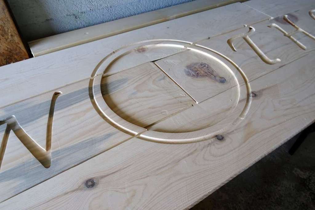 Travail essentiellement à la défonceuse pour l’usinage des assemblages par rainure et languette ainsi que les lettres de l’enseigne.