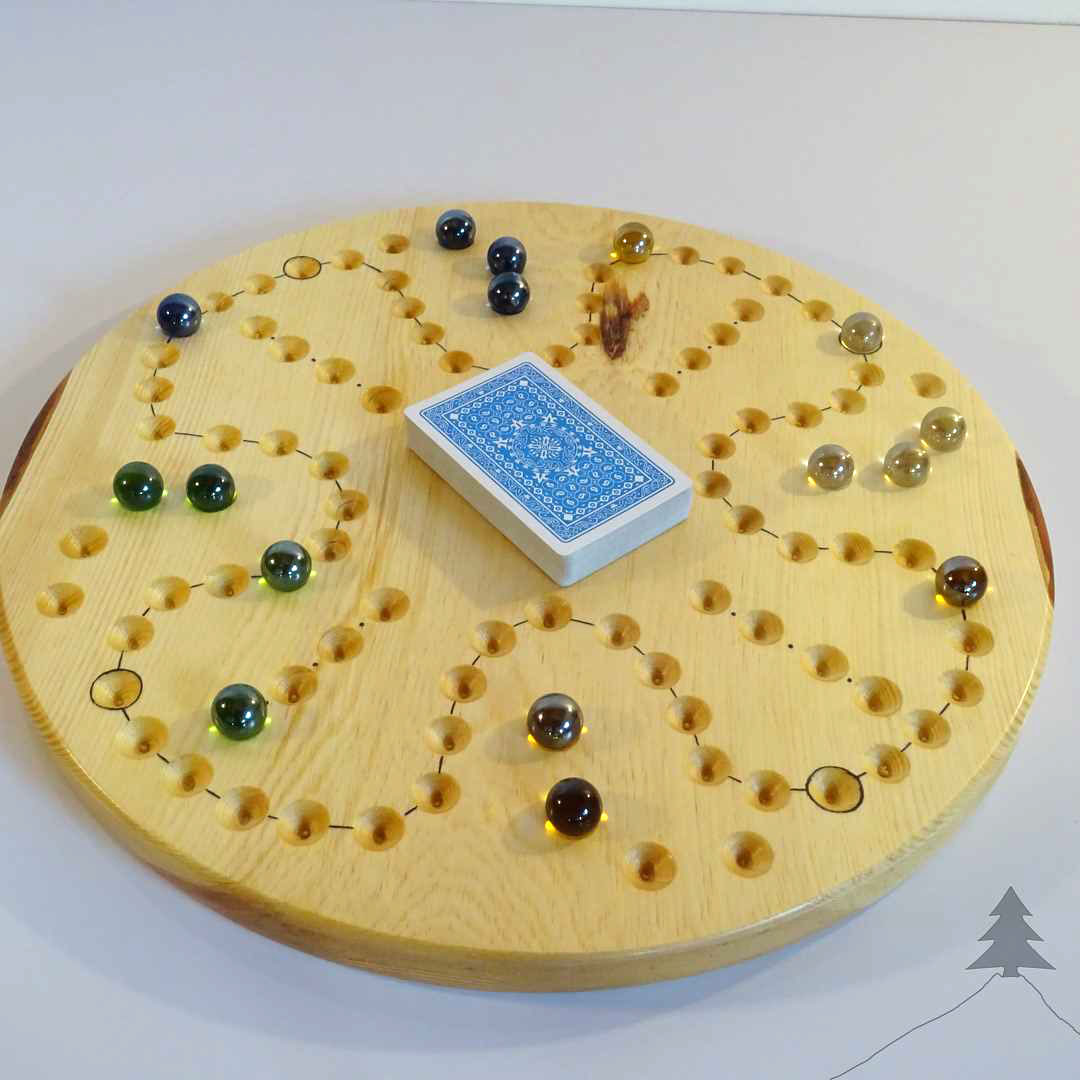 Un jeu super sympa en famille ou entre amis ! Similaire au jeu des petits chevaux, sauf que le dé est remplacé par un jeu de cartes et les chevaux par des billes. Certaines cartes ont des valeurs spéciales ce qui rajoute du piment au jeu….