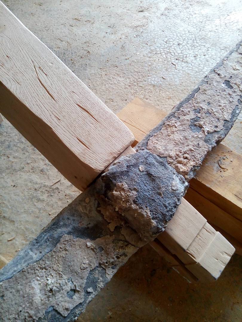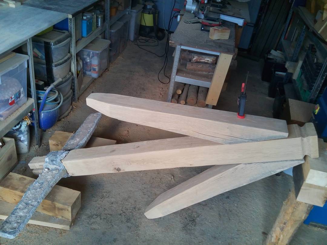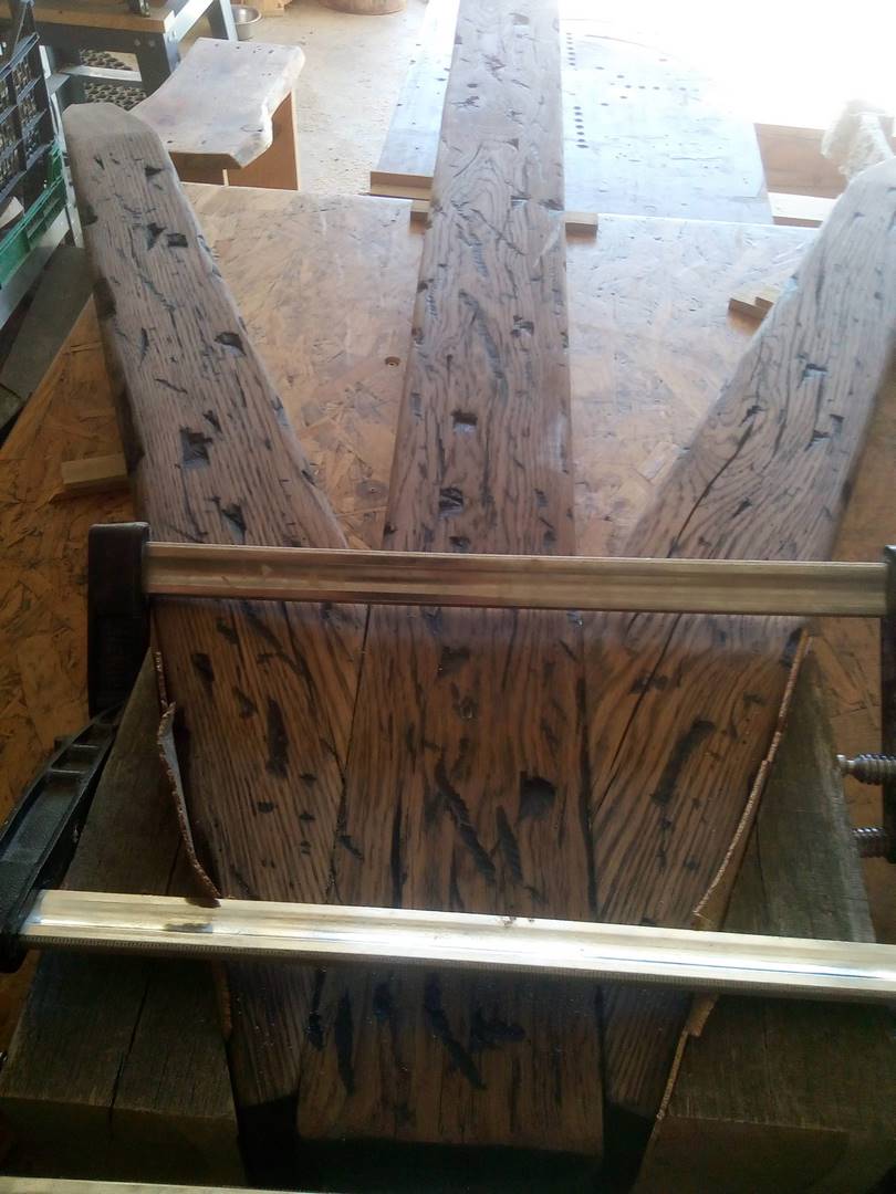 Préparation du bois, découpe des différentes parties, tenon aux ciseaux, vieillissement du bois, teinture..