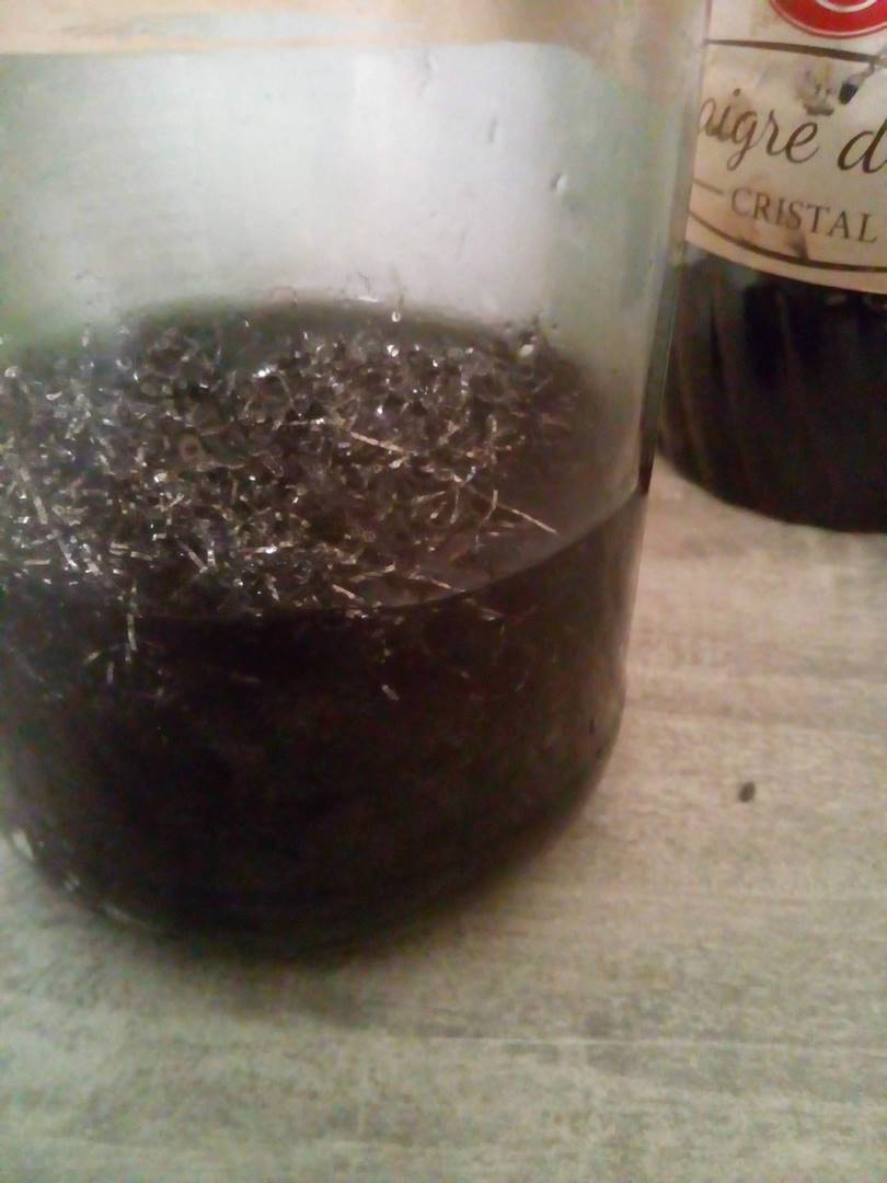 Réalisation d’oxyde de fer pour vieillir le bois et différents outils pour marquer le chêne et le rendre « authentique ».