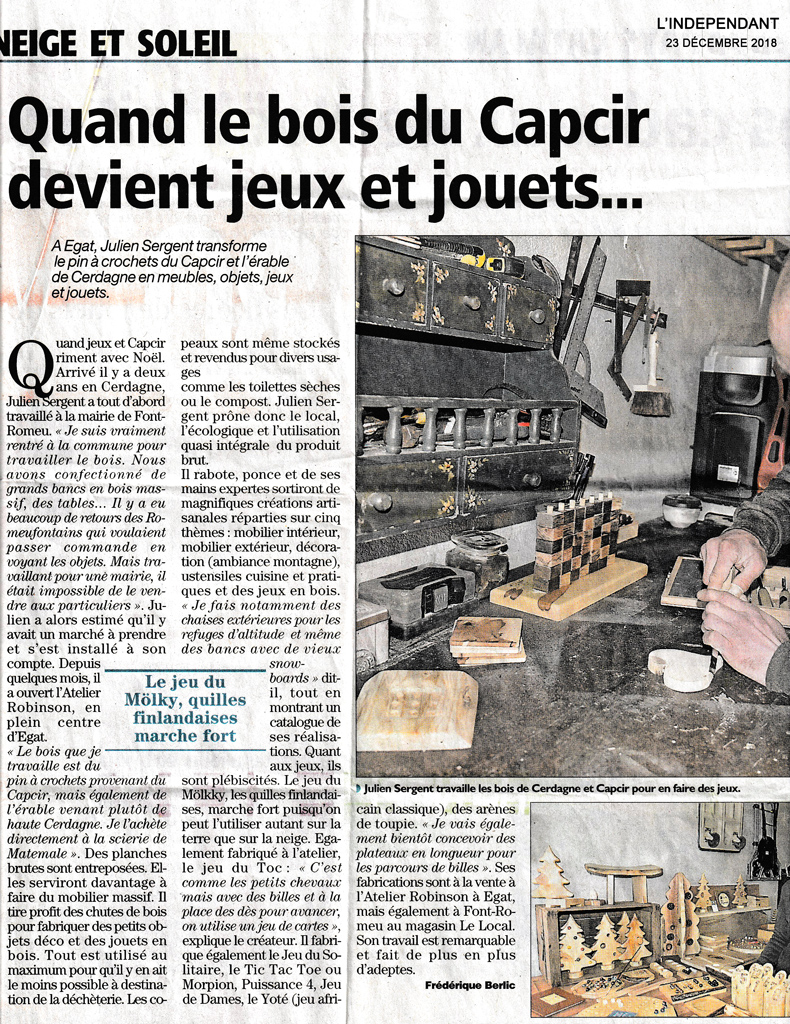 Mon activité se veut proche et respectueuse de l’environnement. 90% du bois est recyclé. Les chutes de bois sont réutilisées pour restaurer des meubles anciens ou fabriquer des jeux en bois. Je travaille le plus possible en circuit court avec des scieries de proximité.