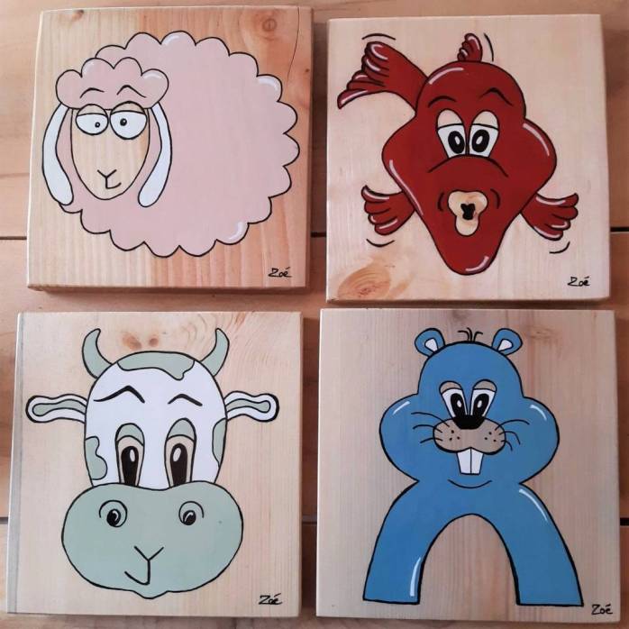 En collaboration avec Zoé, artiste-peintre, nous vous présentons Gaston le mouton, Victor le castor, Pistache la vache et Samson le poisson. Une gamme de mobilier pour chambre d’enfant, objets utiles et décoratifs, hauts en couleurs ! Fabrication à la demande et peinture personnalisée.