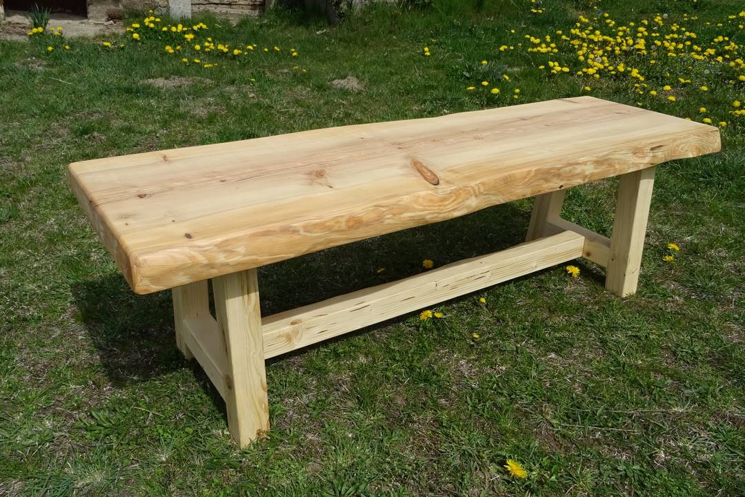 Banc extérieur massif réalisé avec une bille de bois. Assemblage de l’assise et du dossier par rainurage. Solide et conçu pour durer dans le temps.